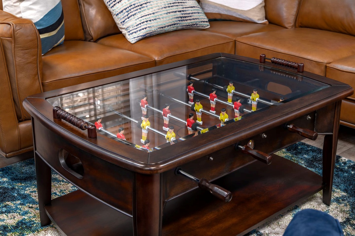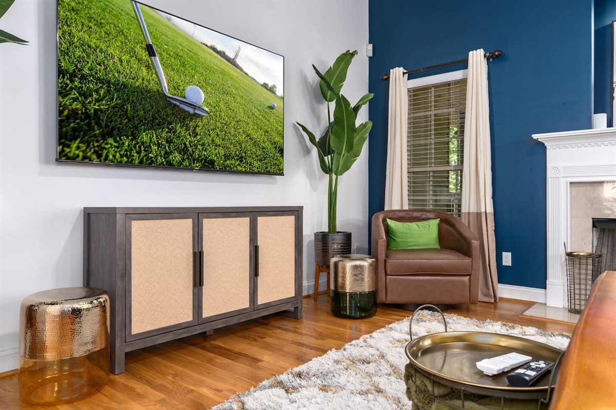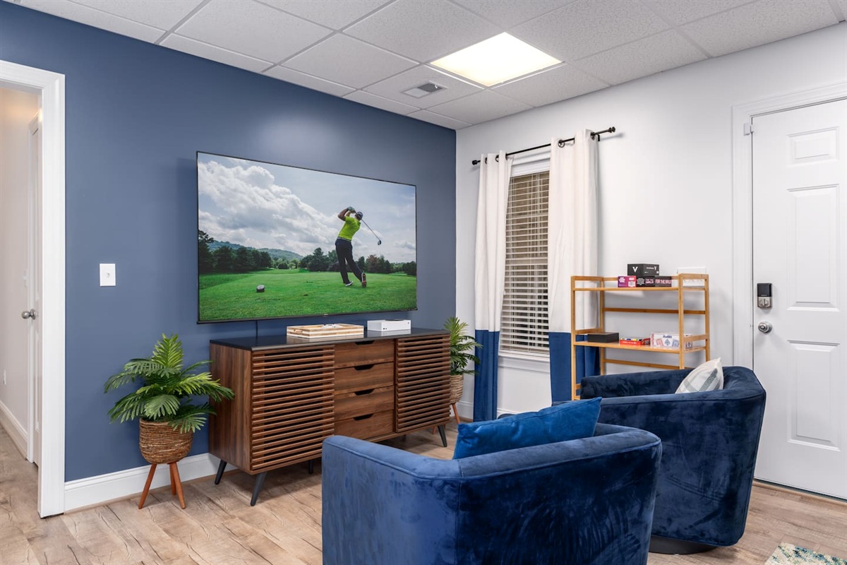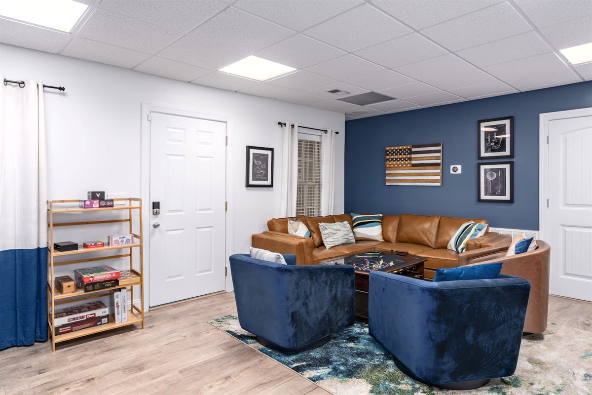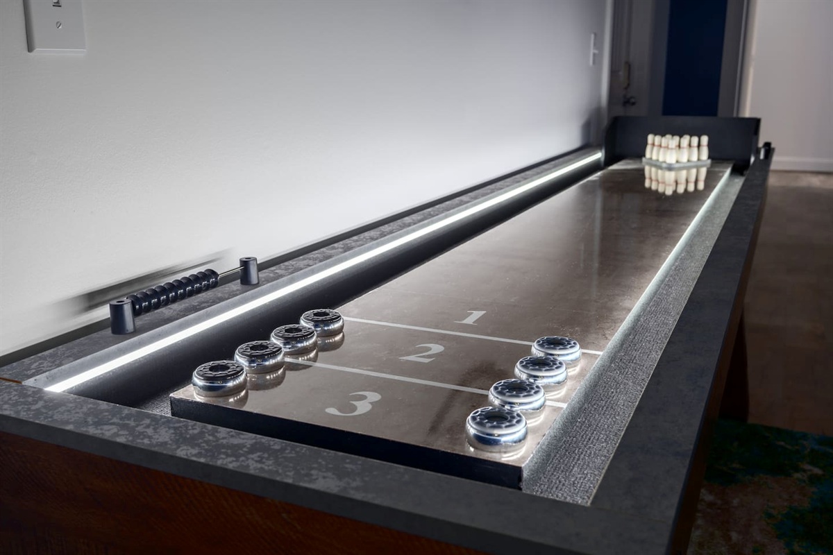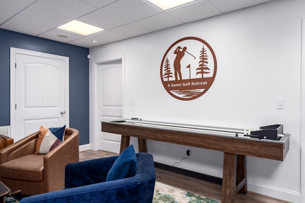 Downstairs entertainment room with lots of fun board and card games, shuffleboard table, 75" large screen smart TV, and gathering spot