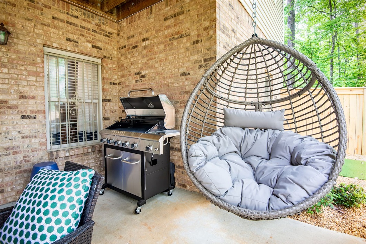 Downstairs patio with picnic tables, Grill, and fun swing chairs. Walk out onto putting green