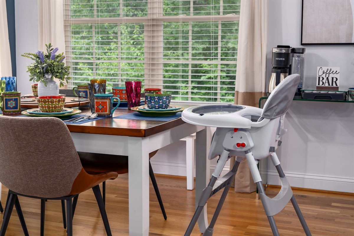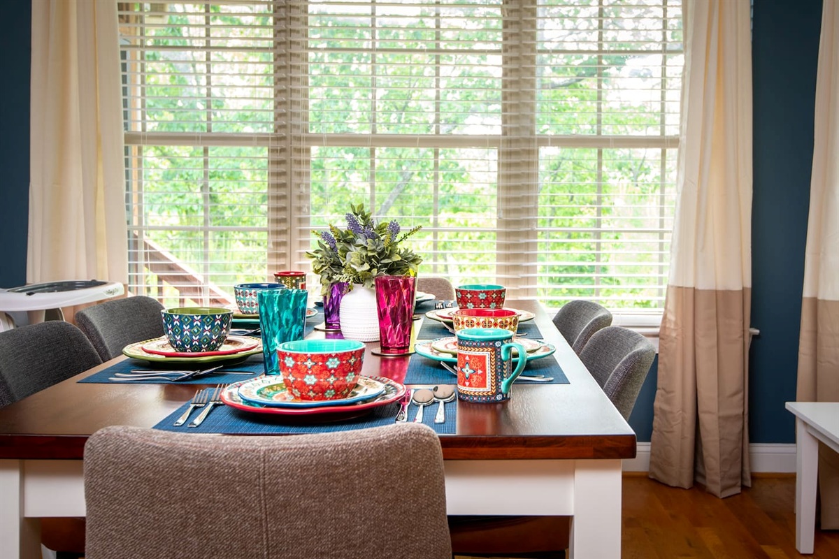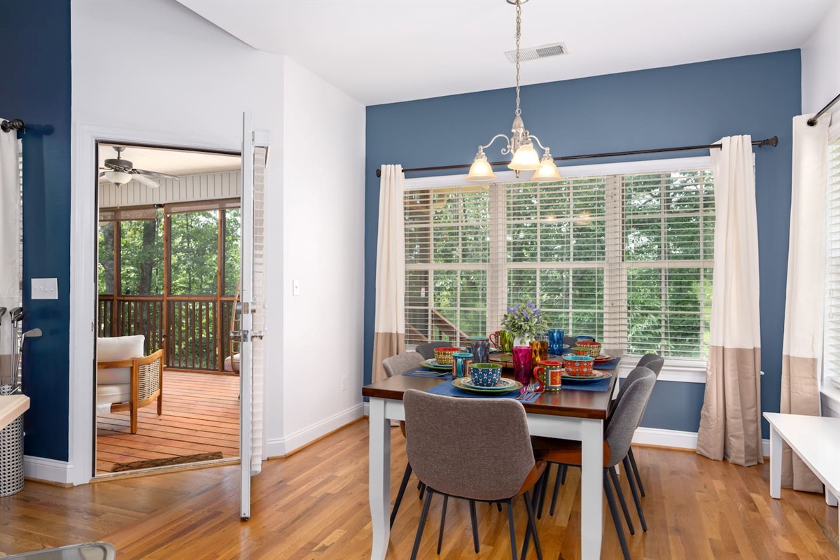 Large dining area with seating for 8 (expands to 8) and beautiful background of the woods and backyard putting green with Azalea bushes.