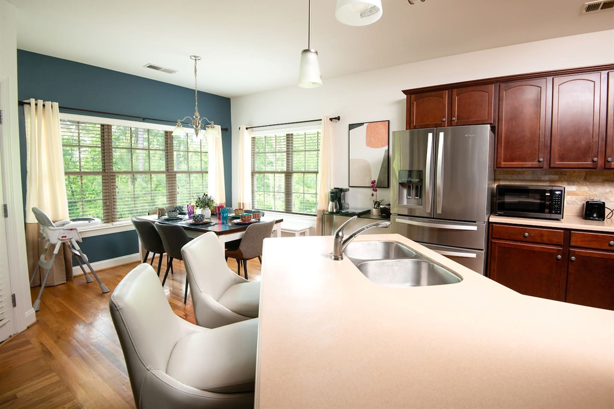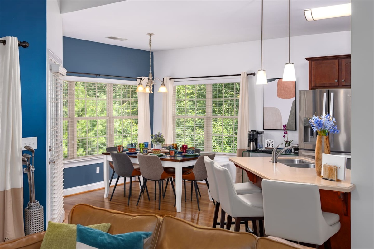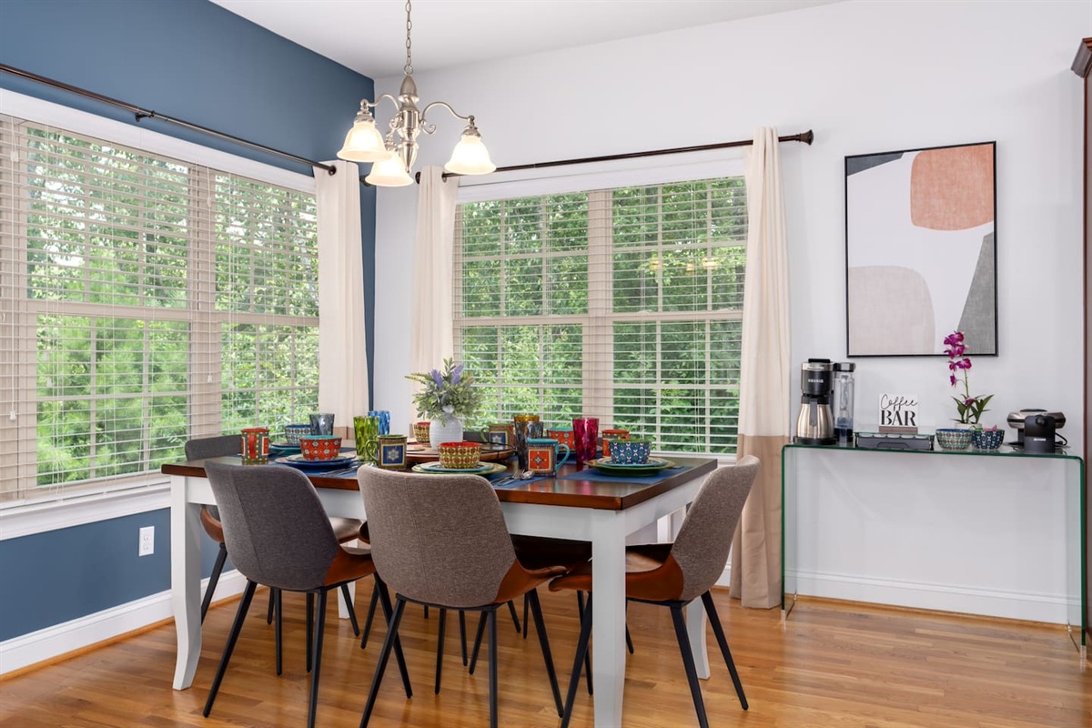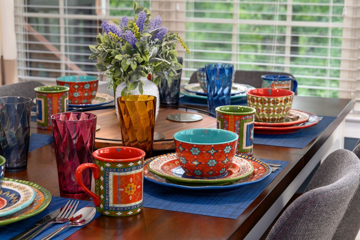 Large dining area with seating for 8 (expands to 8) and beautiful background of the woods and backyard putting green with Azalea bushes.