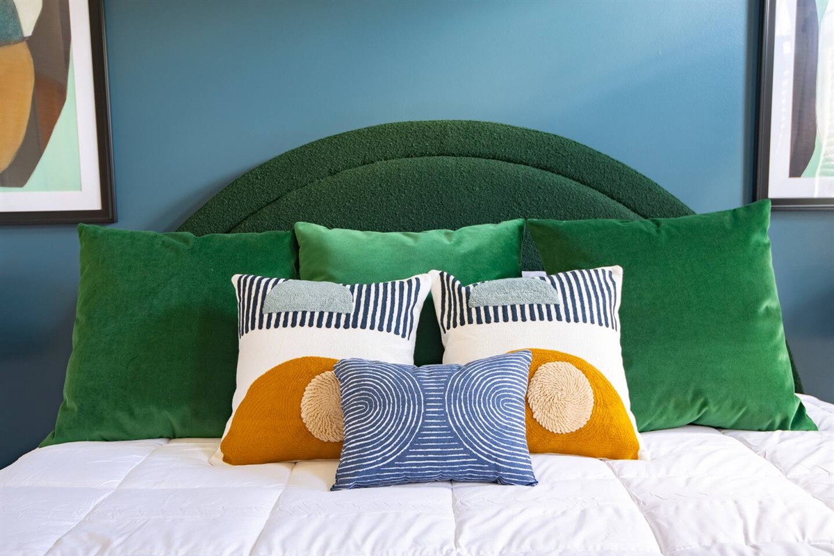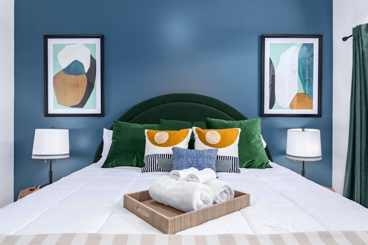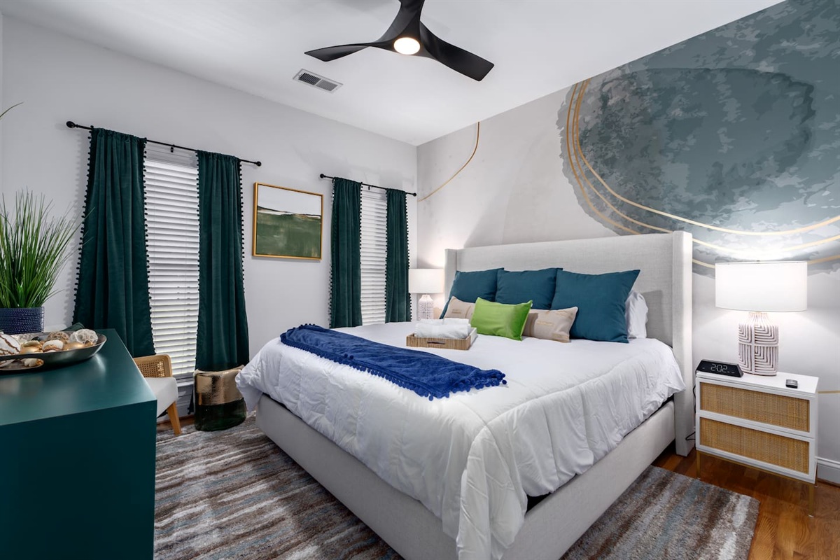 Bedroom #3 - incredible comfort for the perfect sleep! Bamboo cooling sheets and comforter, black-out curtains, King-size bed, custom designed and decorated. Full wall mural- one of a Kind!