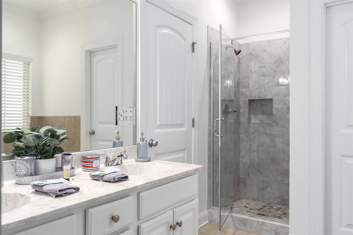 Master bathroom with tub, double sinks, large walk-in closet, and walk-in shower